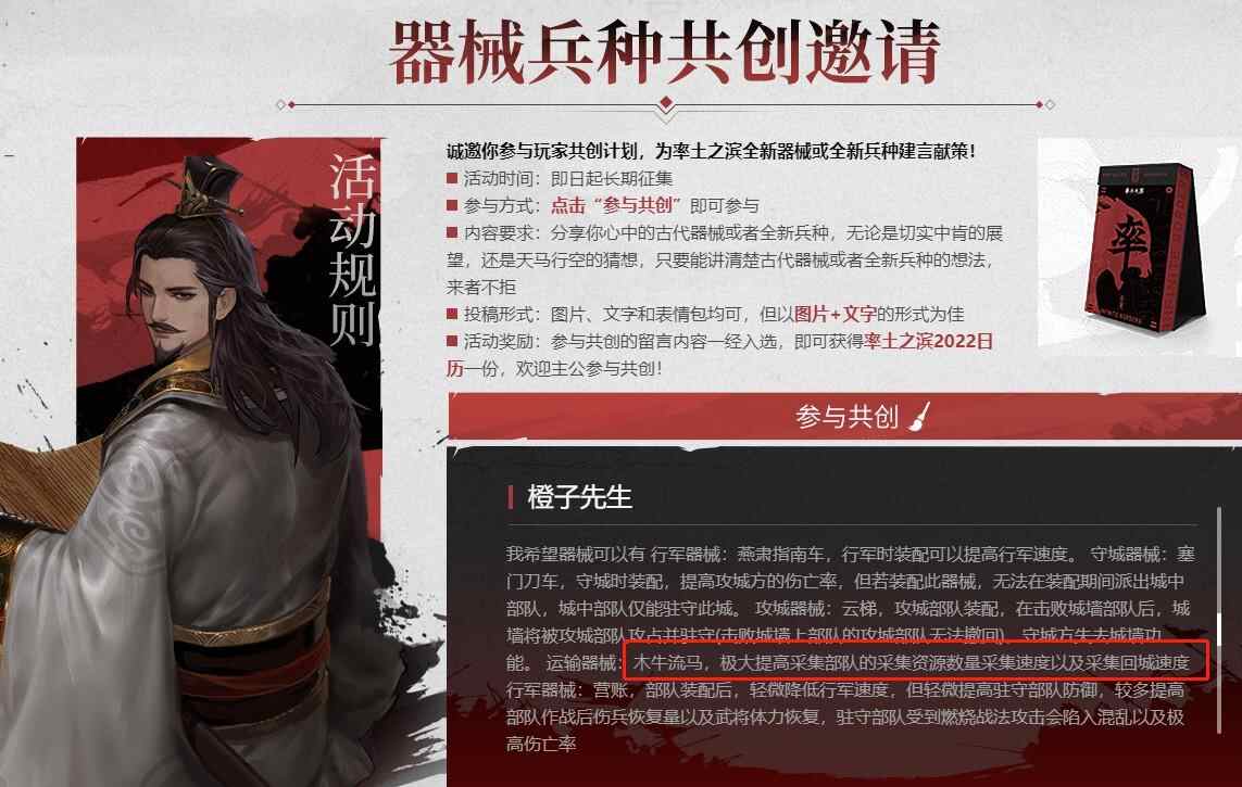由此出发的“器械兵种共创邀请”,更是让无数玩家切实地加入到游戏玩法设计之中。在率土发出的这项计划中,玩家可以分享自己心中的古代器械或全新兵种,无论是切实中肯的展望,还是天马行空的猜想,只要能介绍清楚自己的想法,就有机会让它在游戏中成为现实。