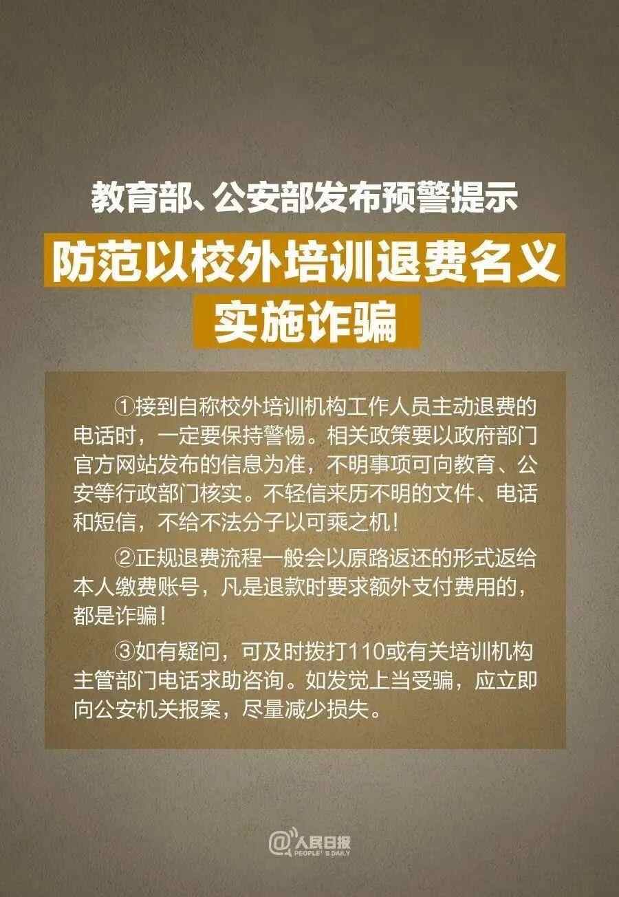 一、接到自称校外培训机构工作人员主动退费的电话时,一定要保持警惕。相关政策要以政府部门官方网站发布的信息为准,不明事项可向教育、公安等行政部门核实。不轻信来历不明的文件、电话和短信,不给不法分子以可乘之机!