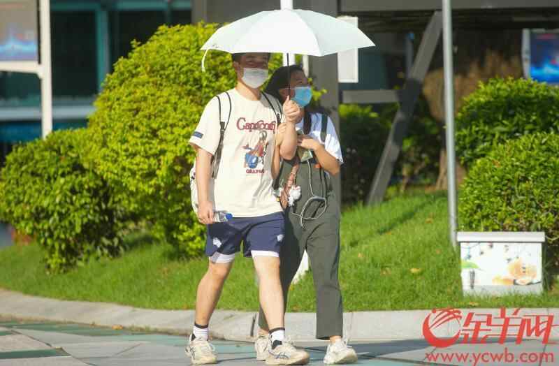 广州市区持续受到高温天气影响,市民在猛烈阳光下撑伞出行 梁怿韬 摄