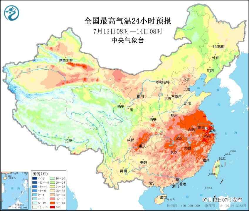 由于预料陕西南部、黄淮南部、西南地区东部、江汉、江淮、江南、华南等地继续高温,中央气象台在7月13日6时继续发布高温橙色预警。根据中央气象台7月13日的中期天气预报,展望7月13至16日,四川盆地、陕西关中、江汉、江淮、江南、华南等地多高温少雨天气,日最高气温一般为35~38℃、局部39℃左右。