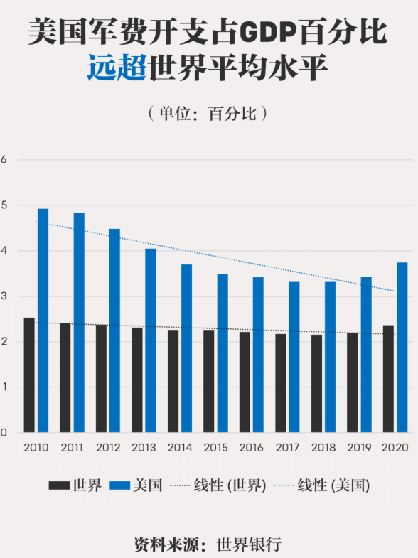 美国军费开支占GDP百分比远超世界平均水平。 (资料来源 | 世界银行)