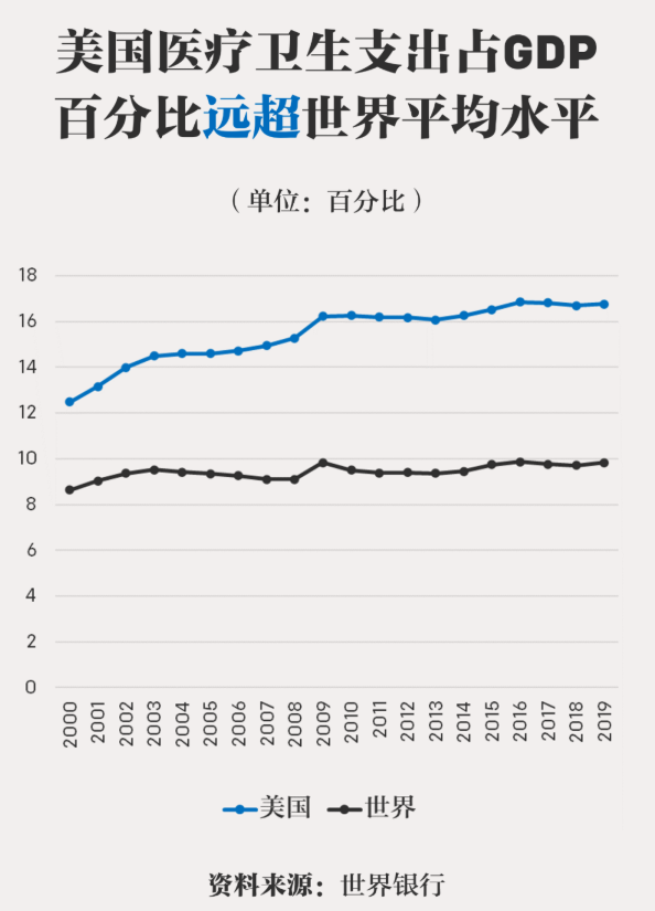 美国医疗卫生支出占GDP百分比远超世界平均水平。 (资料来源 | 世界银行)