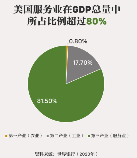 2020年,美国服务业在GDP总量中所占比例超过80%。 (资料来源 | 世界银行)