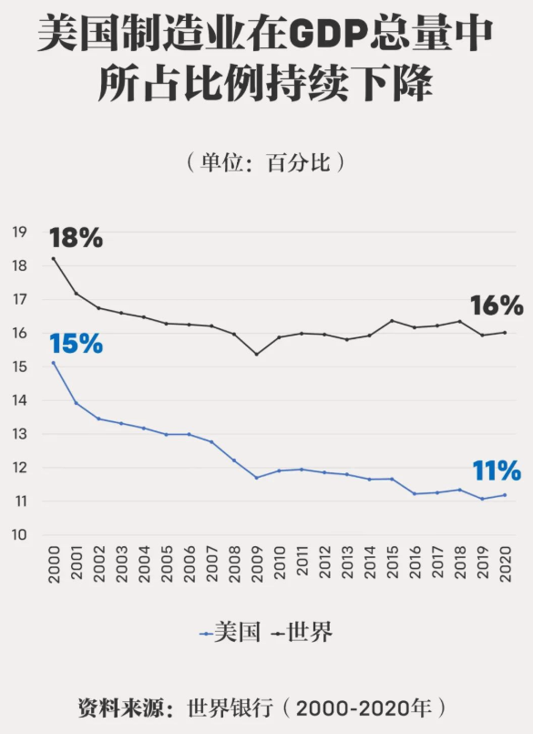 2000年至2020年,美国制造业在GDP总量中占比持续下降。 (资料来源 | 世界银行)