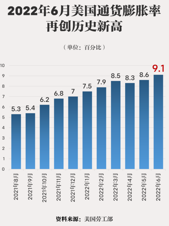 2022年6月,美国消费价格指数飙升至9.1%,创41年来新高。(资料来源 | 美国劳工部)