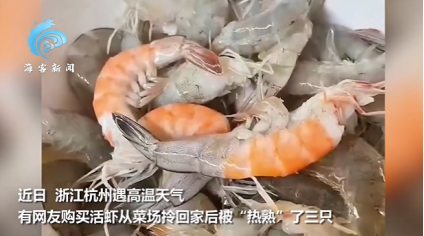 杭州网友晒出袋子里红了的虾,称从菜场买活虾,到家后发现熟了三只。