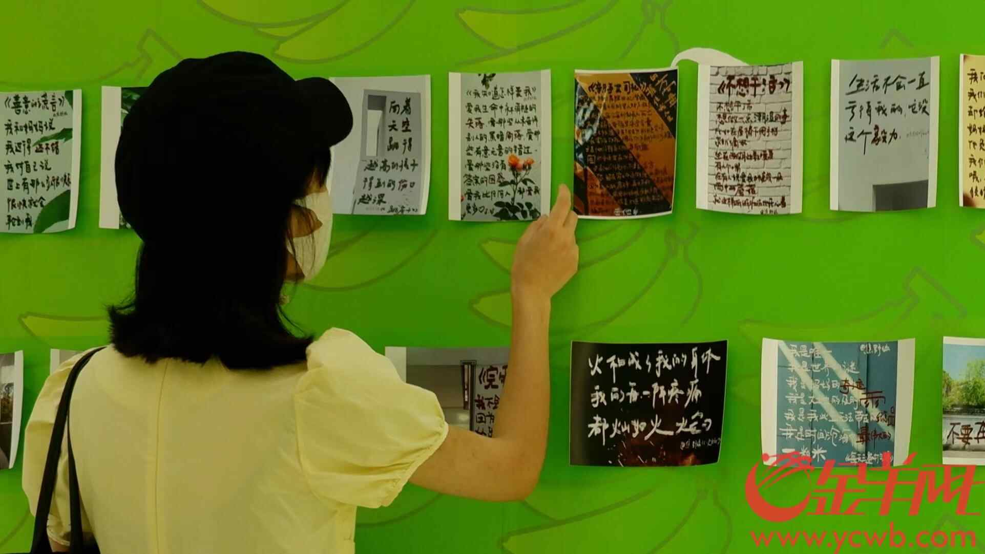 步入展览现场,清新活力的绿色装潢吸人眼球,可爱的香蕉娃娃散落各处,温柔而富有力量的诗歌以吊旗、影像等形式放满涂鸦屋,吸引了不少市民驻足品读。