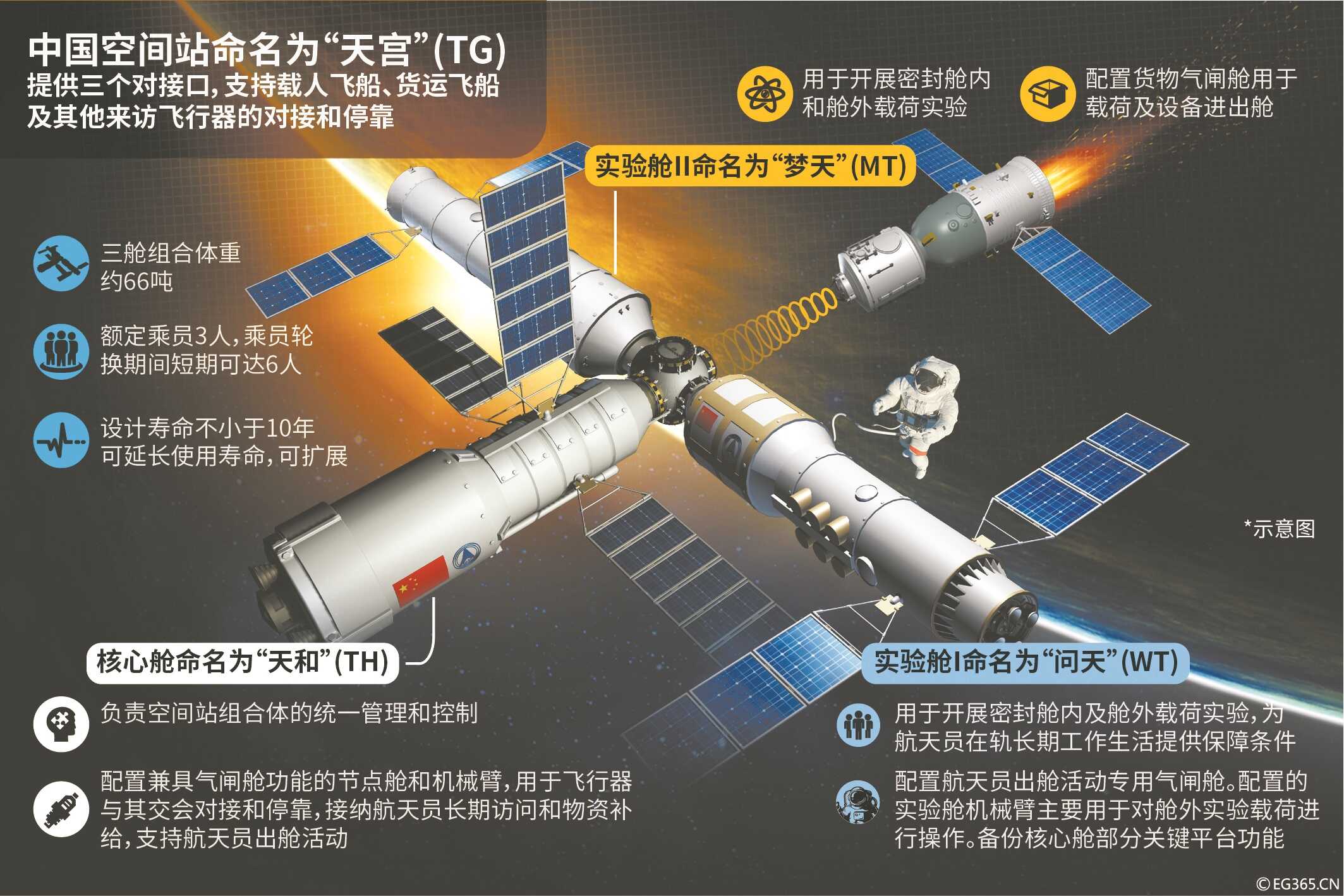 天和核心舱是中国空间站的中枢,也可以说是“大脑”,用于统一控制和管理空间站组合体,为航天员提供生活和工作的场所,同时支持开展科学研究项目。