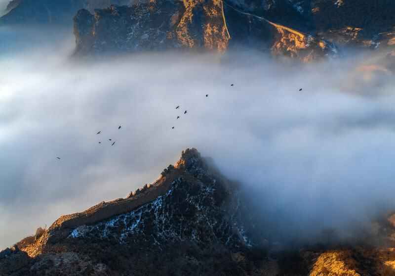 三道关长城,它由上而下倒挂于悬崖峭壁之上,是万里长城风光中一绝,被称为“奇绝的长城倒挂三道关”。