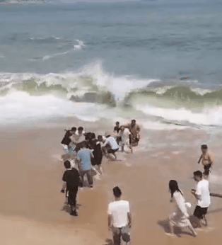 几位英雄接力跳进巨浪救人