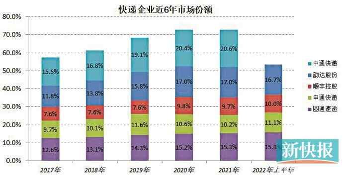 记者发现,上述业绩预盈的三家快递公司市场份额均较2021年有所增长。如圆通由15.28%升至15.78%;顺丰由9.74%升至9.96%;申通增长幅度最大,由10.23%升至11.09%。同期仅有韵达发生下降,由16.99%降至16.68%。总的来看,今年上半年四家公司市场份额总和有所上升,由2021年的52.24%升至53.51%。四家公司排位依次为韵达、圆通、申通、顺丰,虽然总体保持不变,但在半年里企业间有多次超越。