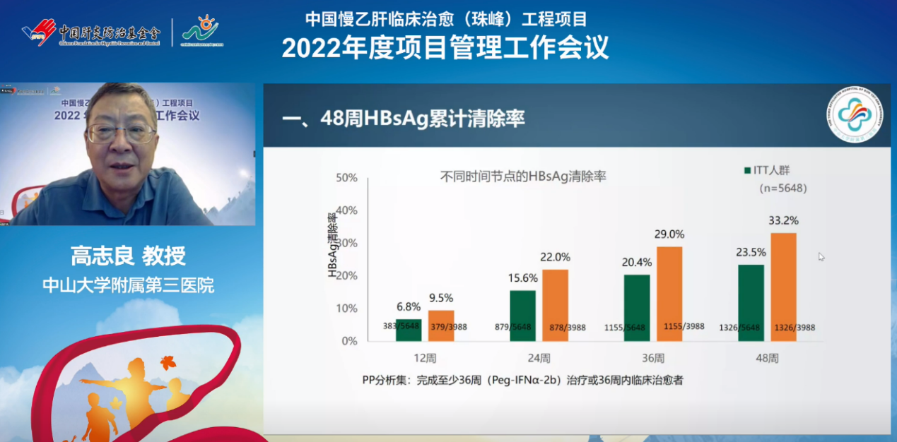 近日,中国慢性乙型肝炎临床治愈(珠峰)工程项目2022年度项目管理工作会议在北京召开。会议强调,2022年是中国慢性乙型肝炎临床治愈(珠峰)工程项目(以下简称“珠峰项目”)运行的第5年,也是见成效的关键之年。目前,已入组患者22507例(部分患者未完成48周疗程),临床治愈3803例,治疗36周以上患者的48周HBsAg清除率达到33.2%,初步形成慢性乙型肝炎核苷(酸)经治患者临床治愈的基本治疗规范。