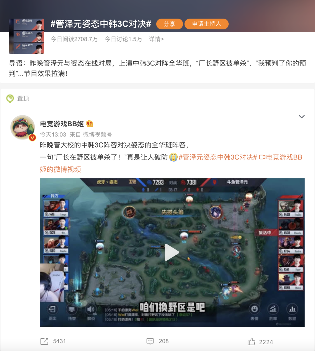 而在与大校管泽元PK对决时,双方形成了鲜明的中韩3C对决,在PK过程中,一句“厂长在野区被单杀了”让不少玩家破防,纷纷刷起了“别碰我F6”的弹幕。随后姿态“愈加过分”,不断入侵野区,凭借小Wei的强力输出,拿下比赛。整个直播过程全程高能,笑点不断,也成为了今日的热搜话题。
