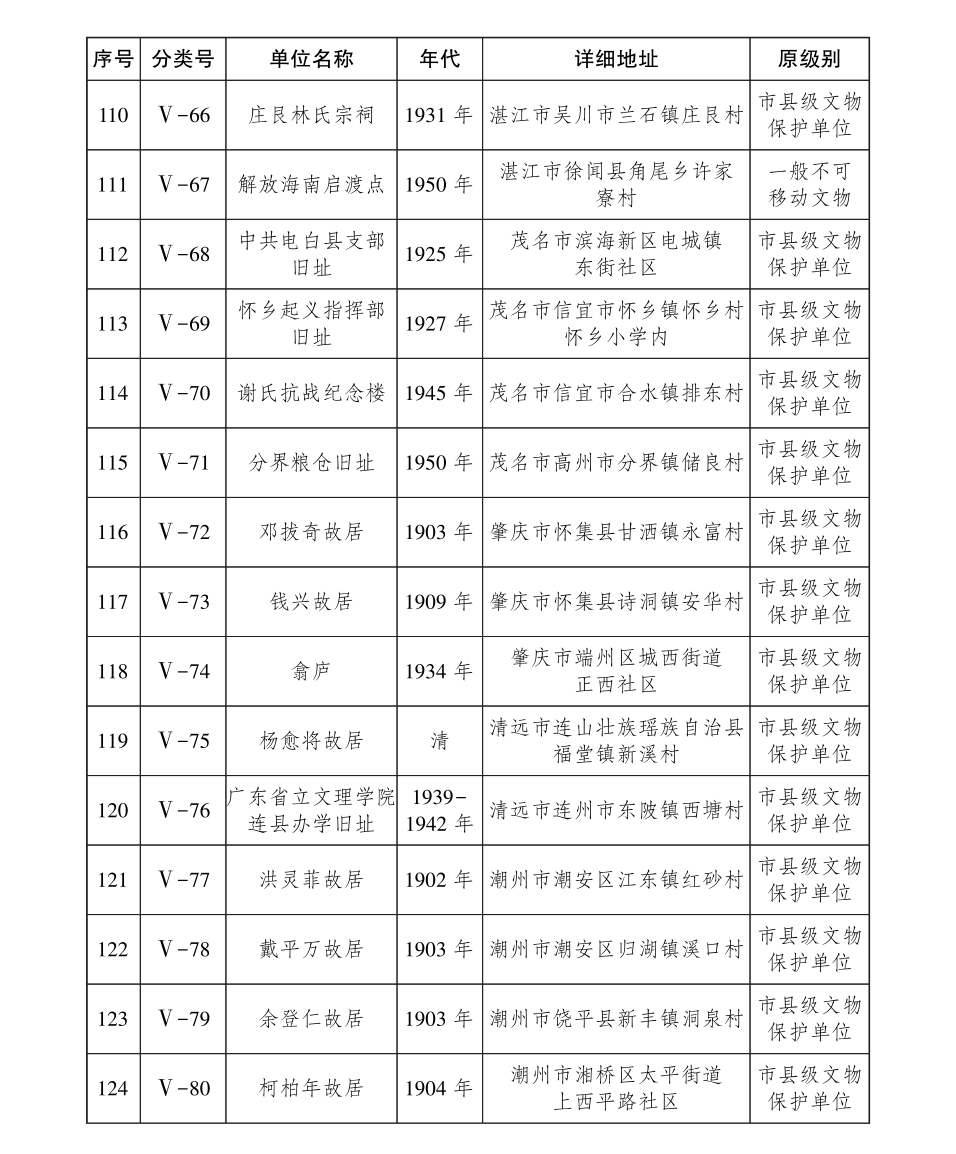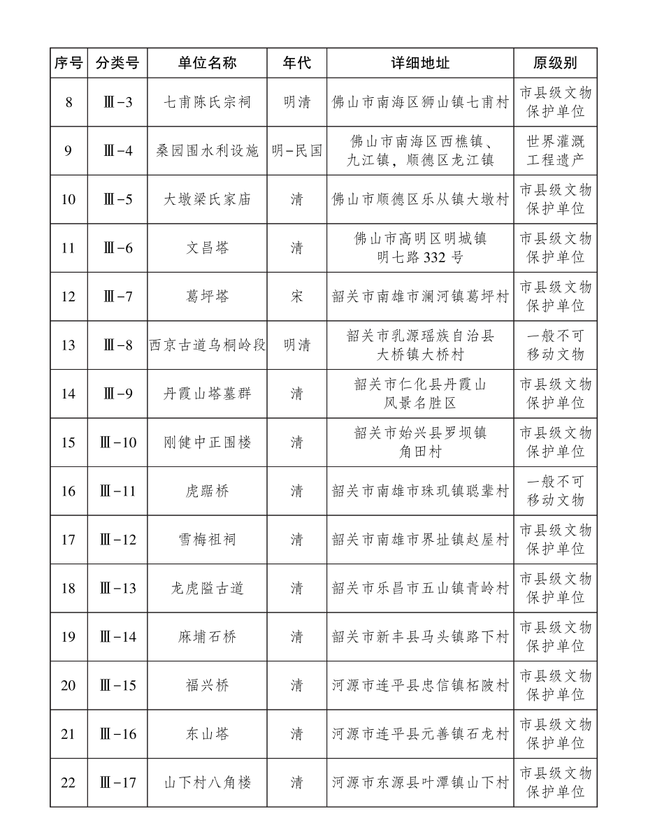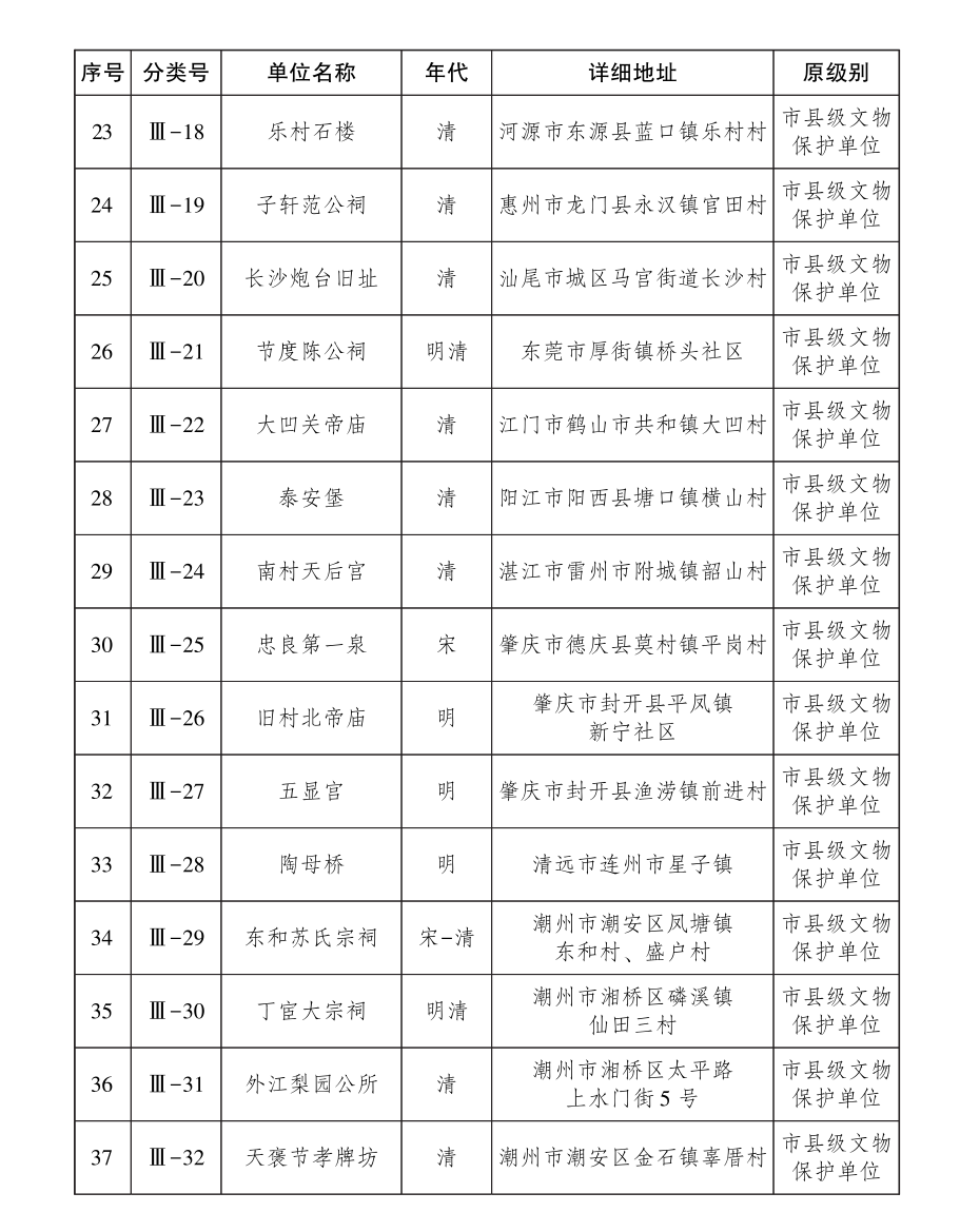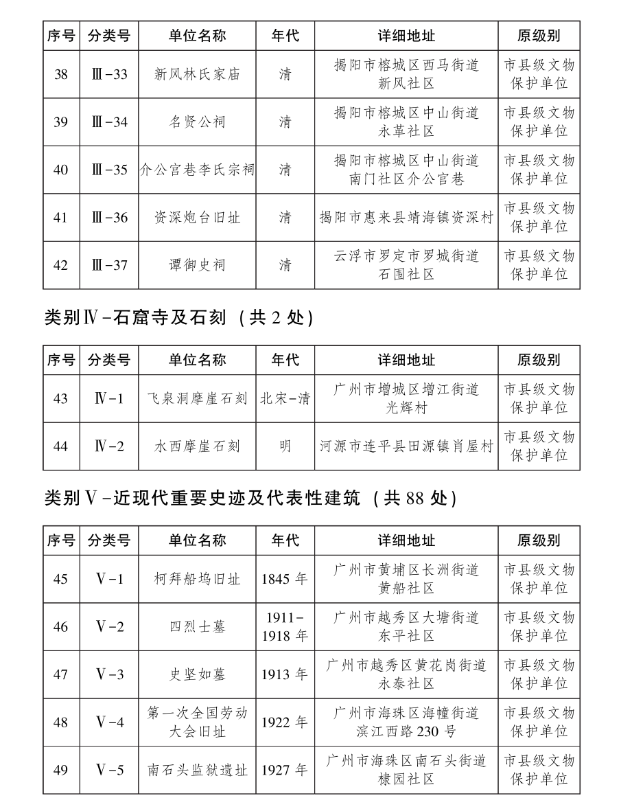 在第十批广东省文物保护单位中,包括古文化遗址3处、古墓葬2处、古建筑37处、石窟寺及石刻2处、近现代重要史迹及代表性建筑88处。