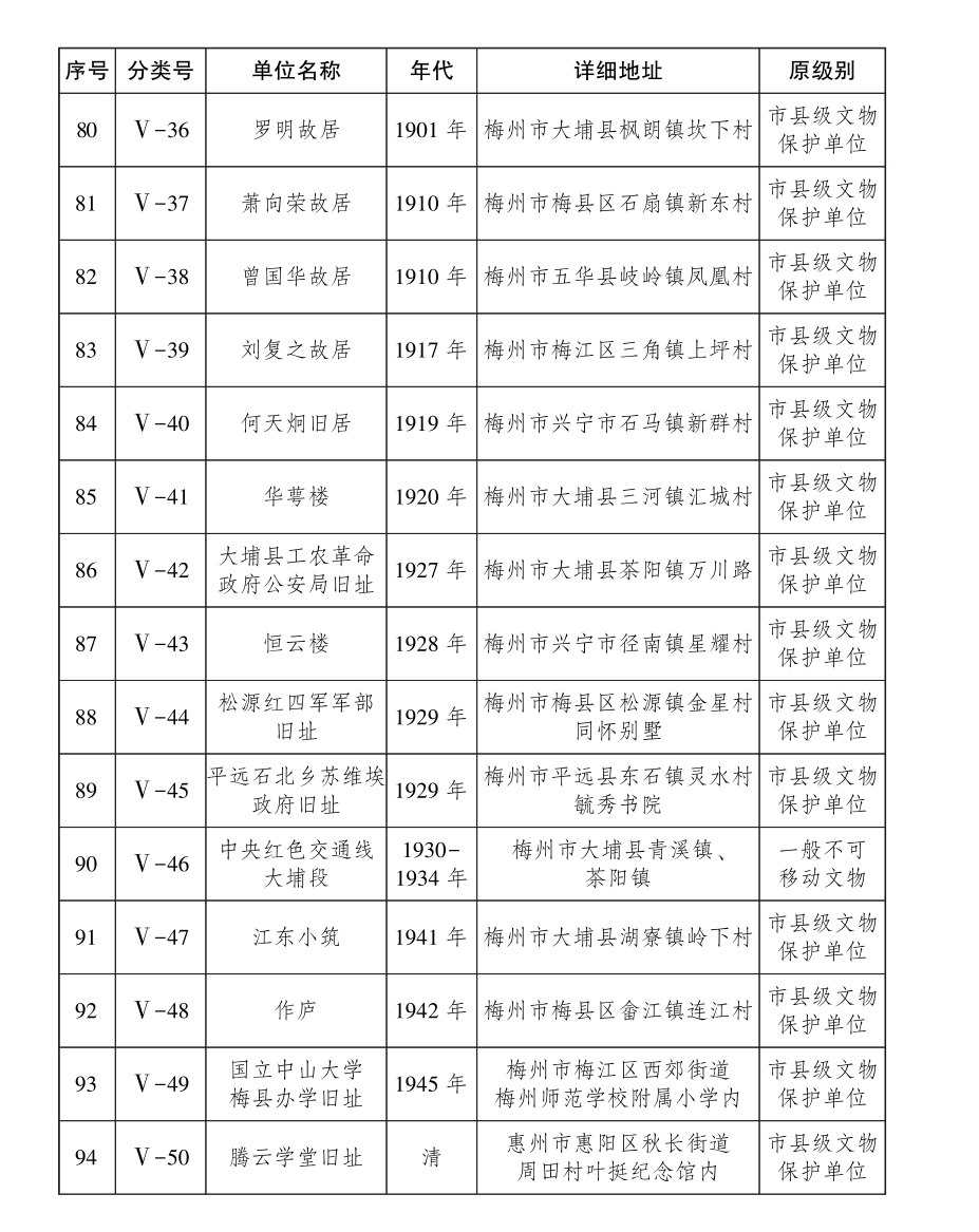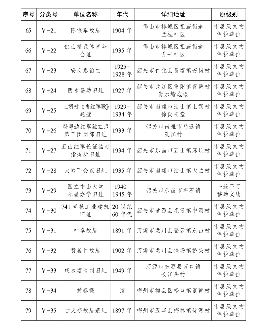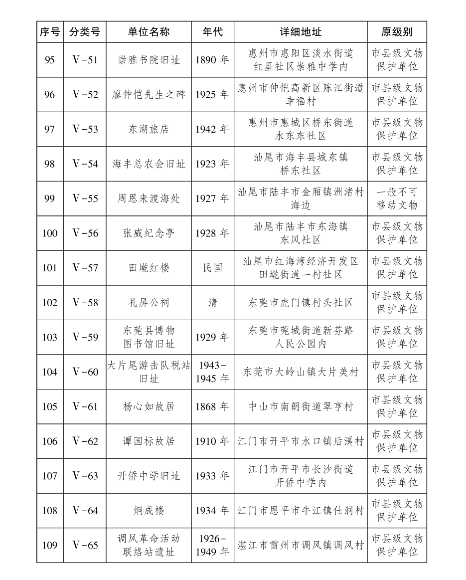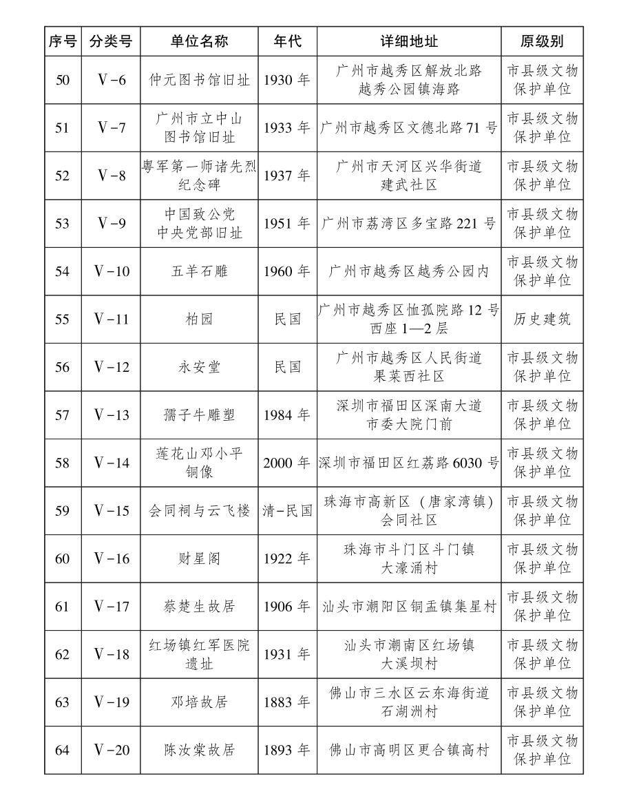 在第十批广东省文物保护单位中,包括古文化遗址3处、古墓葬2处、古建筑37处、石窟寺及石刻2处、近现代重要史迹及代表性建筑88处。
