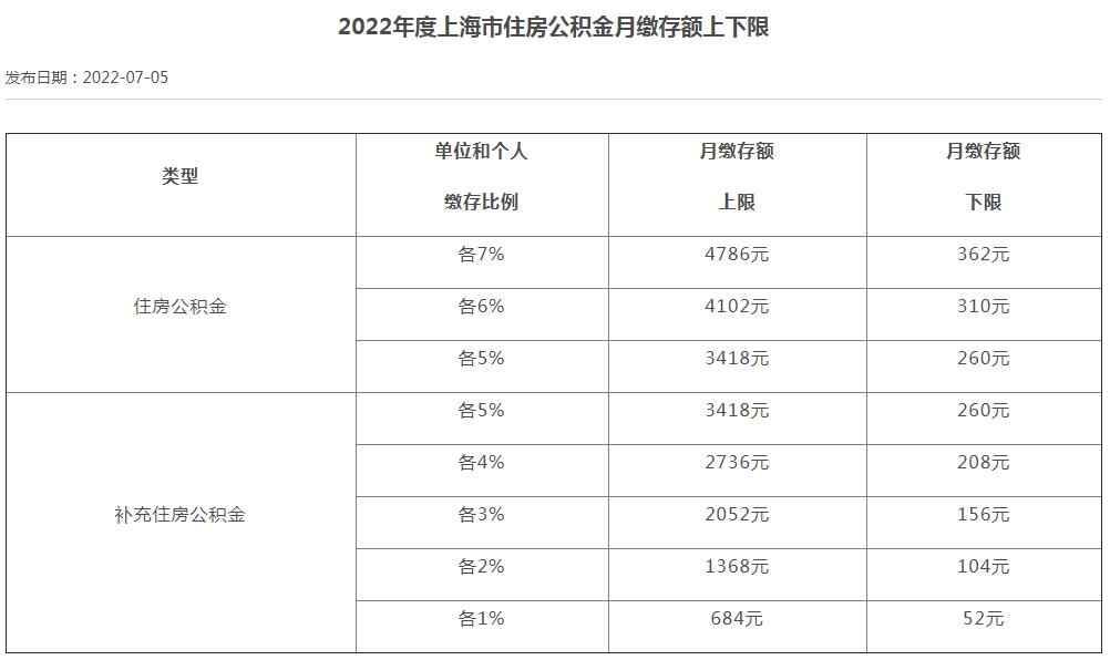 另外,上海住房公积金和补充住房公积金缴存基数最高不超过34188元,最低不低于2590元。住房公积金按职工本人和单位各7%的缴存比例所对应的月缴存额上限为4786元,月缴存额下限为362元。