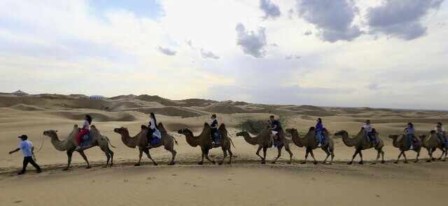 在这里,外国网红们乘坐沙漠观光索道,纵览沙漠壮观景象;体验滑沙,在沙海与沙共舞、与漠“贴贴”;骑骆驼穿行沙丘上,聆听驼铃阵阵;还欣赏了国家非物质文化遗产《鄂尔多斯婚礼》表演,参加大漠篝火晚会……外国网红们与神秘大漠亲密接触,领略别样民族风情。