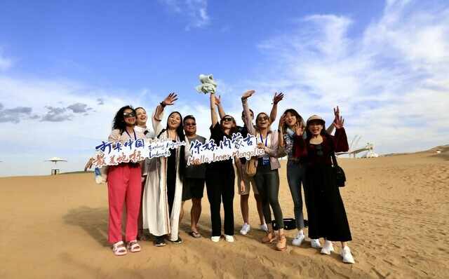 7月28日下午,2022“打卡中国·最美地标——你好,内蒙古!”网络国际传播活动走进位于内蒙古鄂尔多斯市达拉特旗境内的响沙湾旅游景区。沙丘连连,鸣沙阵阵,苍茫辽阔、瑰丽奇特的响沙湾,让外国网红们流连忘返。