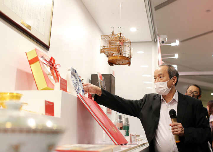 “这是上海大白兔奶糖,当年在香港风行一时。”郑宝鸿指着橱窗内一个旧糖果盒说。这个泛黄的铁皮盒上印着卡通大白兔和中英文的品名。