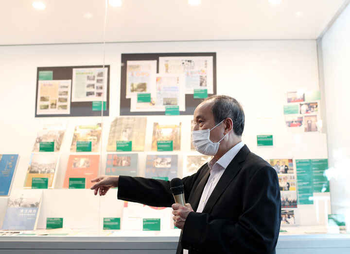 郑宝鸿为香港书展做展览介绍(7月19日摄)。新华社记者 李钢 摄