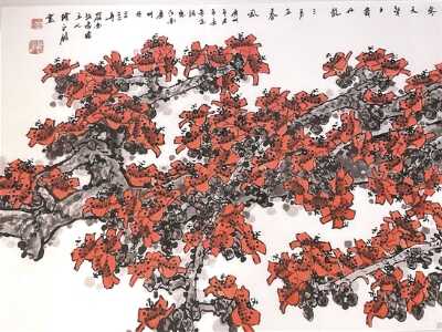 林蓝的中国画作品《春天》特为广州国家版本馆七层贵宾室主厅创作。作品以中国南方特有的木棉花为主题,以金为底,以红为主,色调由大红、橙红渐错,以期简练、突出而有力。墨色层层,水渍交触,源于岭南画派居廉居巢先师撞水撞粉技法,望可质朴而堂皇。