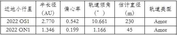 小行星2022 OS1是7月23日首次观测到的,当时视亮度约20.9等,视运动速度为0.895度/天,预估直径达到230m。小行星2022 ON1是7月24日首次观测到的,当时视亮度约20.5等,视运动速度为0.681度/天,预估直径约为45m。这两颗近地小行星的视运动速度均远高于普通主带小行星的视运动速度。通过共享数据驱动国内外观测设备的后续观测,已确定其轨道参数,确认是两颗Amor型近地小行星。