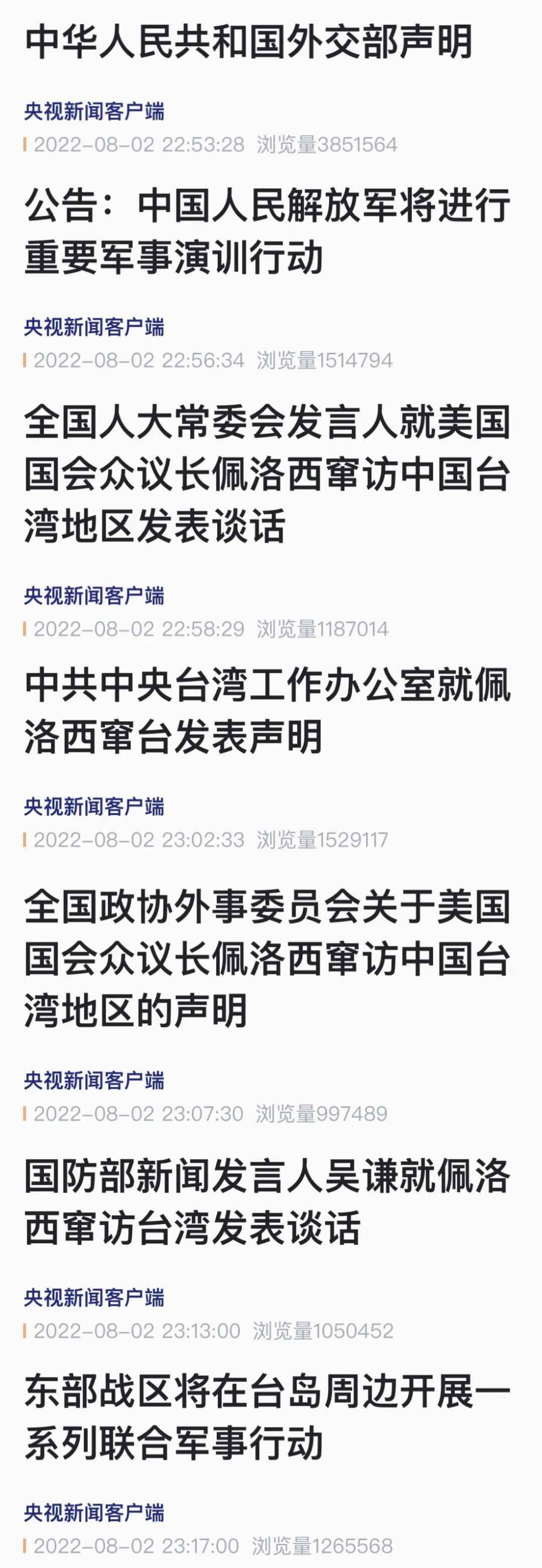 8月3日,央视新闻客户端发布独家现场视频稿件《独家现场视频!东部战区位台岛周边海空域实战化联合演训》《国务委员兼外长王毅就美方侵犯中国主权发表谈话》《中共中央台办发言人受权就依法惩治“台独”顽固分子发表谈话》《国台办宣布对“台独”顽固分子关联机构予以惩戒》《外交部召见美国驻华大使:中方坚决反对、强烈谴责佩洛西窜访台湾》《商务部:暂停天然砂对台湾地区出口 自8月3日起实施》《海关总署:暂停台湾地区柑橘类水果和冰鲜白带鱼、冻竹荚鱼输入大陆》,及时发布外交部、国台办等权威部门消息,表达我方立场及举措,引发强烈反响。