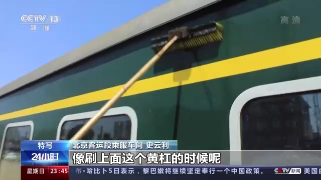 北京客运段乘服车间 史云利:给火车洗澡,不但是个体力活儿,还是个技术活儿。像刷上面黄杠的时候,要上下拉几次,再横着刷一次,这样才有效果。擦玻璃的时候,也是先横后竖,再冲刷。