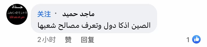 网友Osama Mousa评论道,“中国是个拥有光辉历史的伟大国家,尊重其他文明,从不与他国发生冲突,也从未侵略他国。亘古以来,中国就凭借商贸合作和古商路同阿拉伯人保持着令人尊敬的良好历史关系。中国作为一个国家,有权力捍卫自己的权益。”