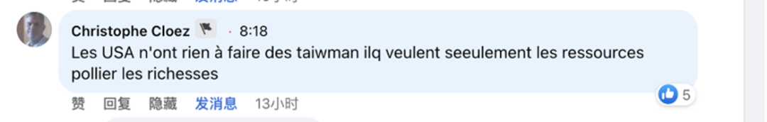 法国网友表示:“台湾是中国的一部分,任何人不应该也不能把他们分开。”“美国把自己当做世界警察,到处搅局,世界上所有冲突里都有美国人,我们应该让他们哪里来回哪里去。”“美国在台湾没有别的想法,就是想攫取资源和财富。”