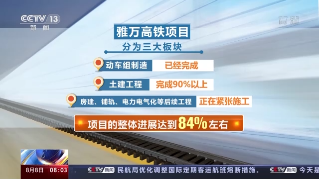雅万高铁项目分为三大板块,目前动车组制造已经完成;土建工程完成90%以上;房建、铺轨、电力电气化等后续工程正在紧张施工。项目的整体进展达到84%左右。