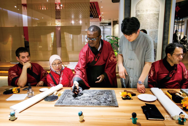外国友人在孔子学院总部体验基地感受中国传统文化(央广网发 济宁市网信办供图)