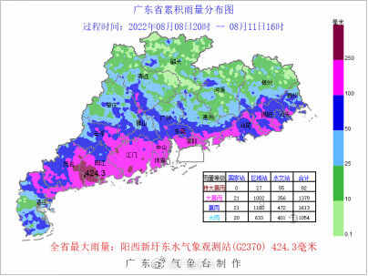 局地雨强强:过程期间(8日20时-11日16时)全省平均雨量71.7毫米,其中阳江阳春市八甲镇录得全省最大日雨量374.5毫米(10日),茂名高州大坡镇录得全省最大一小时雨量83.5毫米。