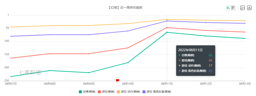 完美世界游戏《幻塔》更新2.1.5版本,于8月11日由腾讯代理的海外版在全球上线,一系列动作让《幻塔》热度攀升,在iOS畅销榜排名上升100位;鹰角网络《明日方舟》于8月12日上线新干员、新玩法,排名飙升至iOS畅销榜第4位。