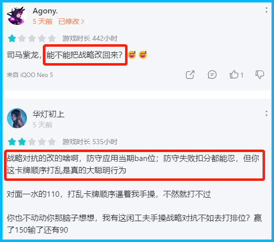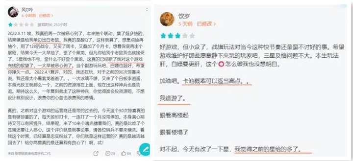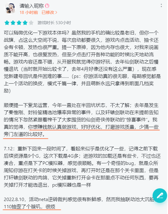 另外,对于《天地劫:幽城再临》近期的优化和运营表现,也有玩家提出了不同意见,认为《天地劫:幽城再临》的内容很不错,但作为战棋类游戏却占用很大空间,且游戏内点击会有卡顿;运营方面则发生了卡池爆率异常、未提前告知联动活动的事故。