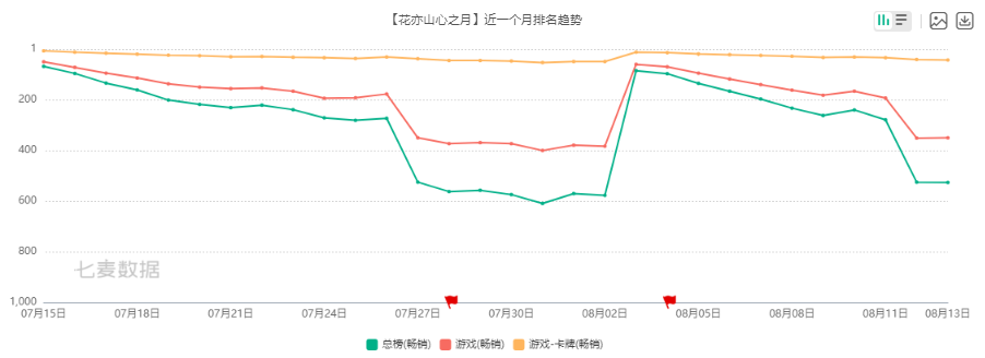 《花亦山心之月》于8月3日开启了七夕大版本“游缘鲸梦”,通过观察榜单情况可以发现,自活动开启以后,该产品排名呈自然下滑趋势,直到8月11日迎来了大幅下降,而“游缘鲸梦”活动的结束时间为8月17日。