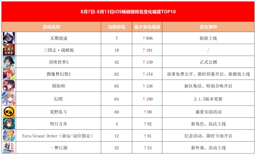 游戏日报整理发现,过去一周(8.7-8.13)内,iOS畅销榜Top50部分产品排名变化明显,其中TOP10左右产品发生较大变化,《无期迷途》、《Fate/Grand Order》(命运-冠位指定)、《明日方舟》等产品新进榜,《英雄联盟电竞经理》、《穿越火线手游》跌出TOP 10 榜单。