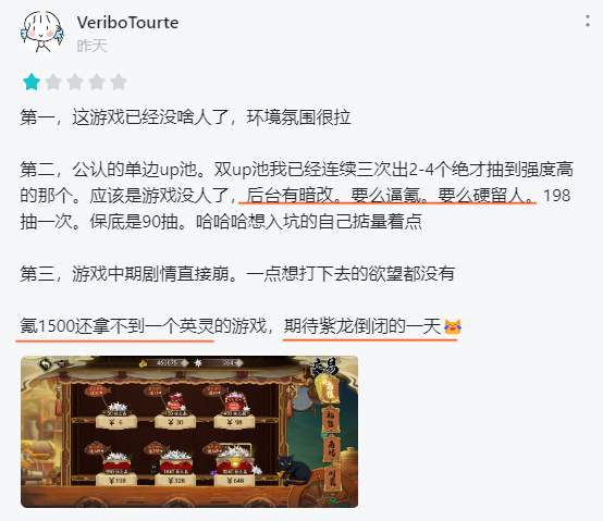 其次,对于卡池的概率,有玩家反馈,双up池中已经连续3次出2-4个绝才抽到高强度英灵,“氪1500拿不到一个英灵”,并质疑官方后台暗改、逼氪。