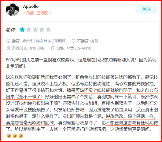 有玩家表示攒了很多抽卡材料,但英灵还没上线就被削弱了技能,和之前公布出来的完全不一样,认为官方“说改就改,跟个笑话一样,毫无原则和底线”。翻阅《天地劫:幽城再临》公告的确可以发现,官方在8月9日(英灵还未上线)时就对白玉堂的技能进行了调整。