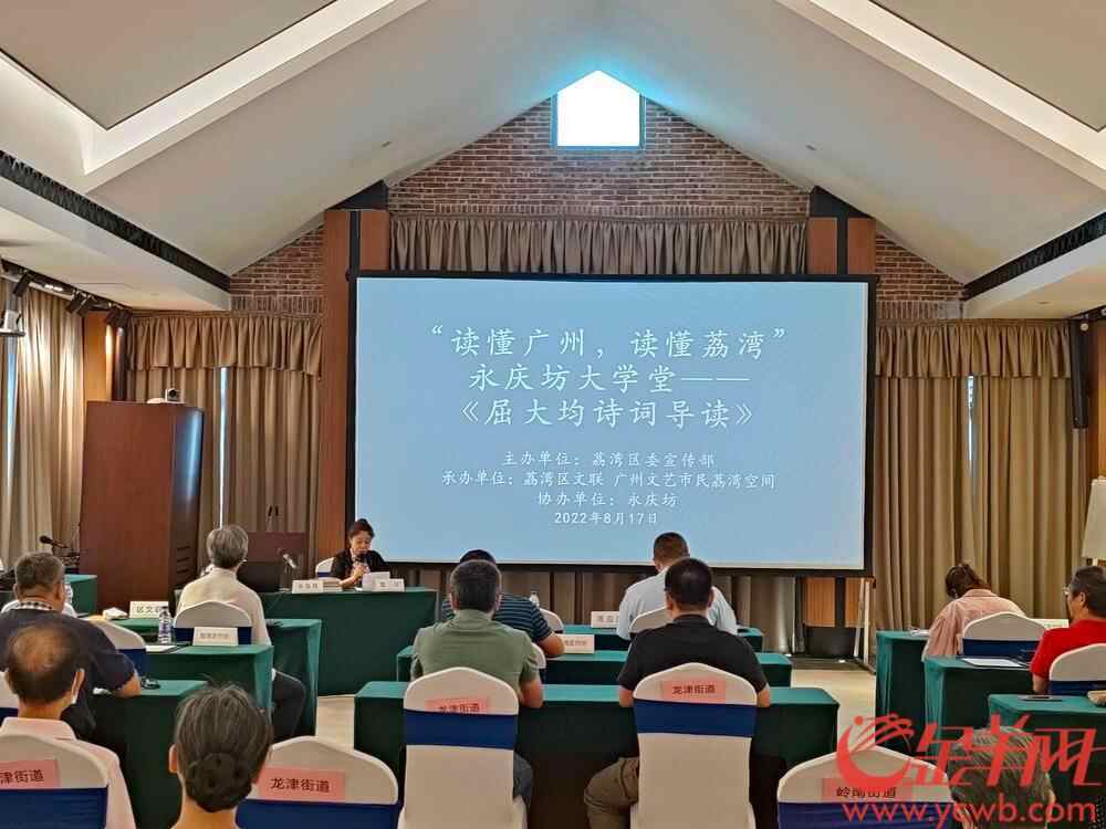 8月17日,“读懂广州,读懂荔湾”永庆坊大学堂《屈大均诗词导读》宣讲活动在永庆坊会议中心举行。中山大学中文系教授、博士生导师张海鸥为观众分享广东著名诗人屈大均的故事,普及诗词文化。