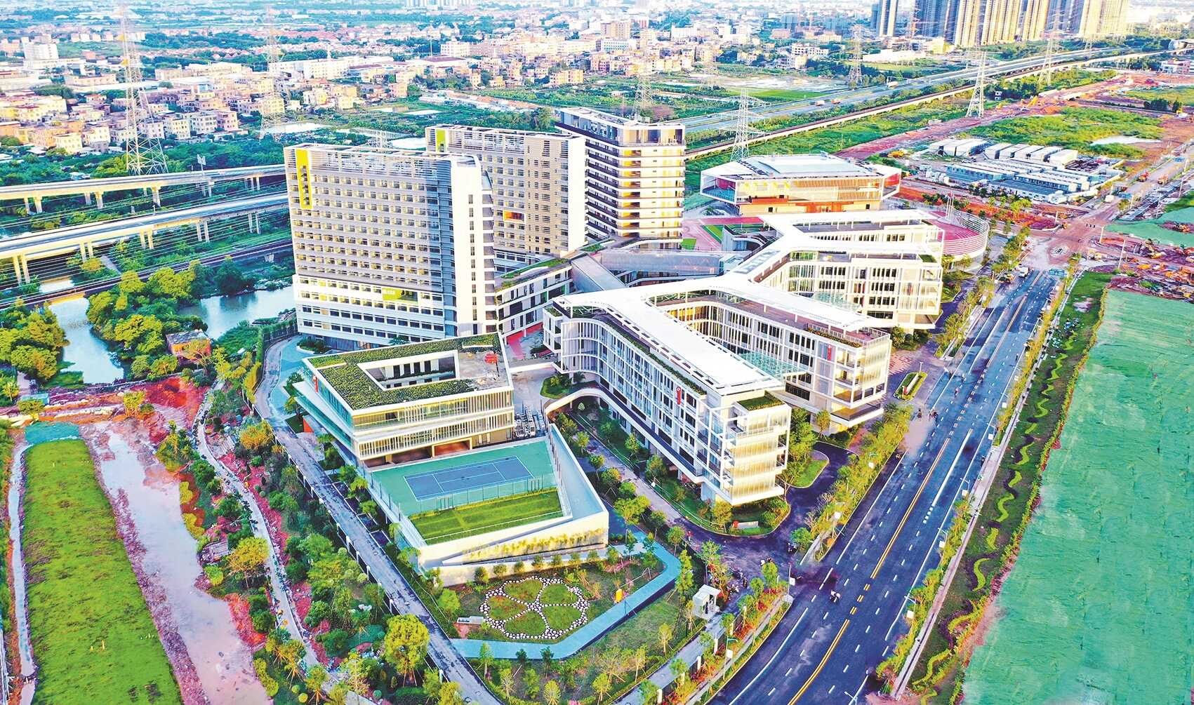 记者了解到,学校以“同心同根”为设计理念,校园景观设计以“粤港同根,湾区同心”为出发点,结合地形方位,通过“建构次级地面”的纵向布局实施施工方案,于标高6米的架空平台之上,将重数百吨的空中连廊衔接,四周布置建筑单体,向心围合共同构成一个教学综合体。