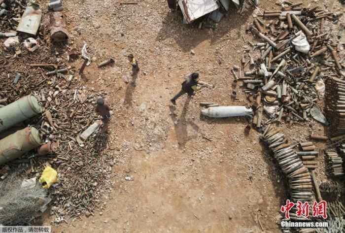 资料图:叙利亚伊德利卜省西北部一个金属废料场上,人们整理堆放的炮弹废料。