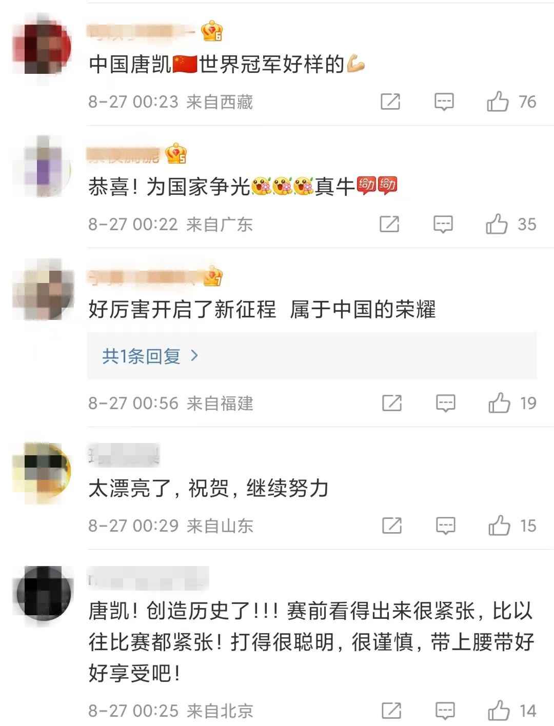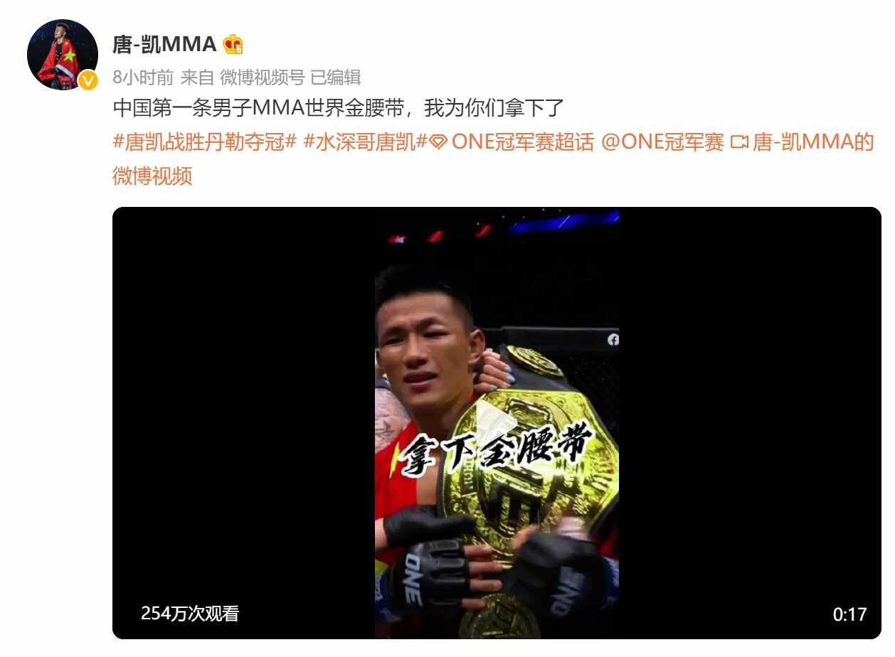23时许,唐凯本人连发多条微博庆祝:“中国第一条男子MMA世界金腰带,我为你们拿下了”。
