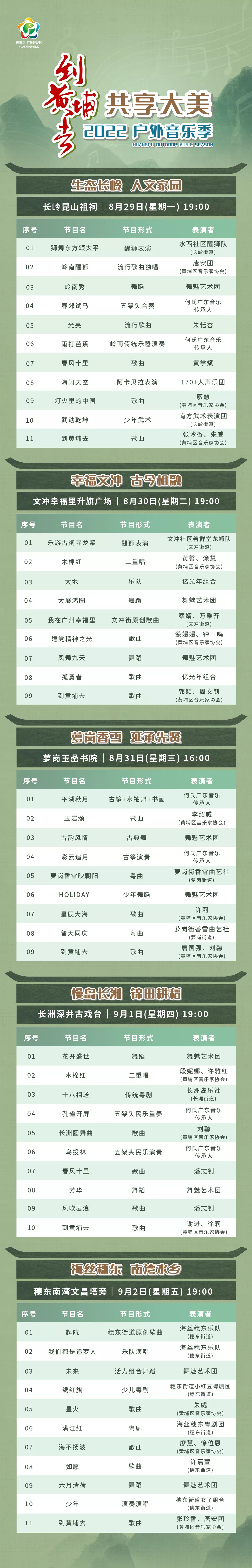 8月30日至9月2日期间,“到黄埔去,共享大美”2022户外音乐季将连续四晚,在文冲街、萝岗街、长洲街、穗东街开展专场演出。节目单抢先看!