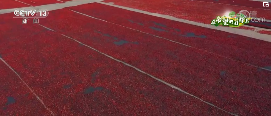 眼下正是新疆辣椒丰收的时节,在新疆巴州博湖县,这两天,椒农们正抢抓晴好天气晾晒辣椒。大片大片火红的辣椒整齐地摊晒在戈壁滩上,宛如一块块红色拼图,与周围黄绿交织的田野嵌套在一起,在大地上绘出一片金秋的丰收盛景。据了解,新疆巴州部分地区光照时间长,昼夜温差大,金秋时节干燥少雨,非常适合种植和晾晒辣椒。这里种植的辣椒个大、肉厚,经过在戈壁滩上暴晒后,变成暗红的干辣椒,不仅可以作为餐桌上的食材,还可用来提取食用色素制作蛋糕、冰淇淋、口红等物品,十分畅销。今年,当地共种植辣椒47万亩,预计产量可达140万吨以上。