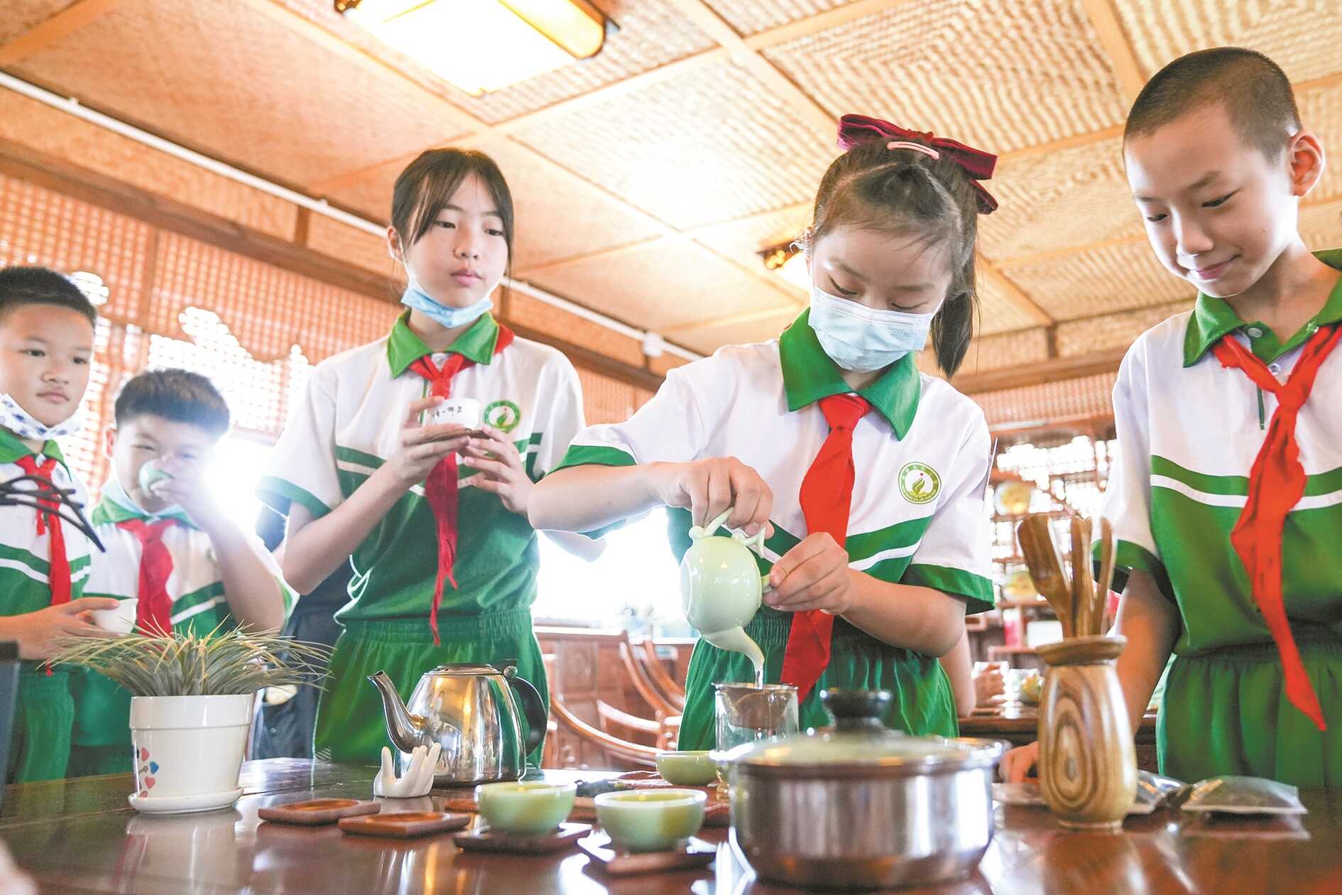 广州荔湾区南塘大街小学“劳动第一课”,学生研习茶艺 羊城晚报全媒体记者 梁喻 摄