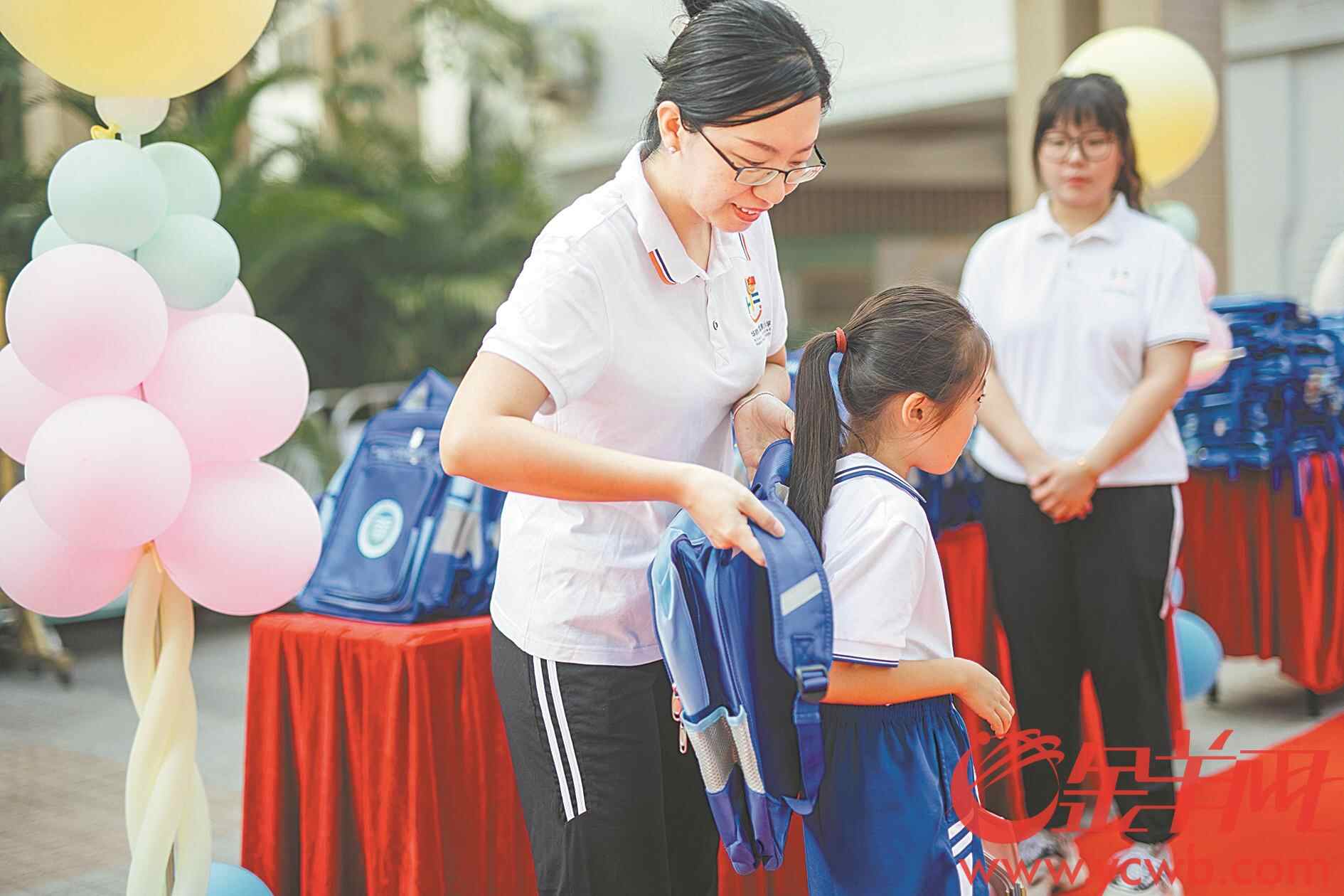 广州南方学院番禺附属小学,老师为新生送上“书包礼” 羊城晚报全媒体记者 蒋隽 摄