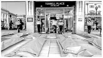 脸书、推特上与美国共和党和右翼势力有关的账户在疫情初期淡化新冠病毒传播的严重性和紧迫性,并执着于散布有关病毒来源的虚假信息。图为美国监督组织在华盛顿特区的脸书办公室前放置“尸袋”,作为对社交媒体上虚假信息的抗议活动的一部分。 人民视觉 供图