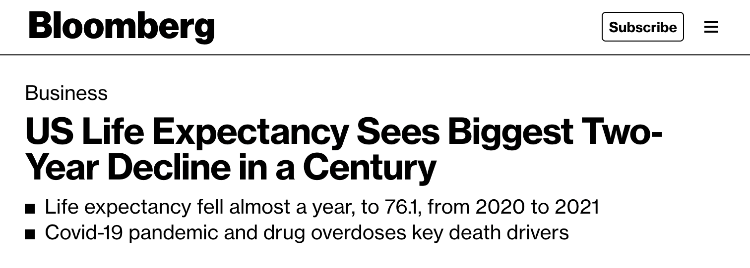 美国疾控中心8月31日发布的最新报告显示,2019年至2021年,美国总体人均预期寿命下降了2.7岁。美联社指出,上一次出现这样的降幅还是在二战期间。彭博社更是指出,美国人均预期寿命出现一个世纪以来最大的两年间跌幅。报告分析称,新冠疫情是首要原因。