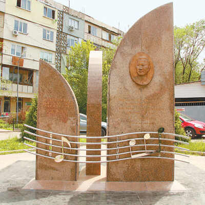 矗立在阿拉木图市“冼星海大道”路口的冼星海纪念碑。 本报记者 曲 颂摄